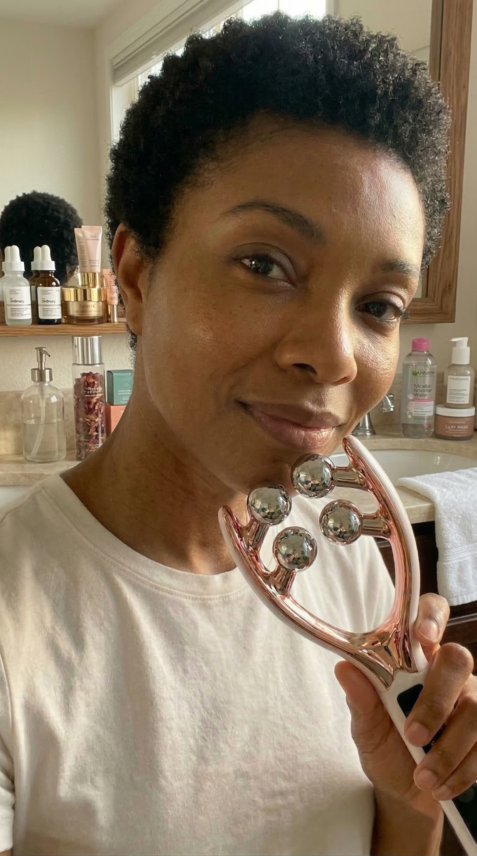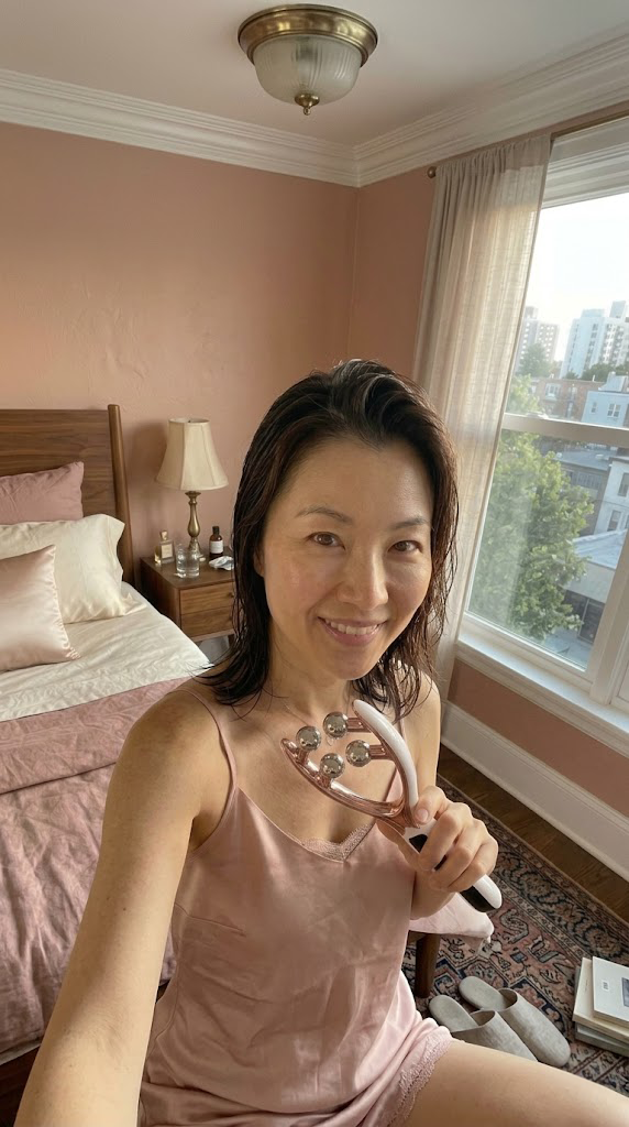 We noticed the full shelf. Retinol, gua sha, firming serums, jade rollers. We did the research.
