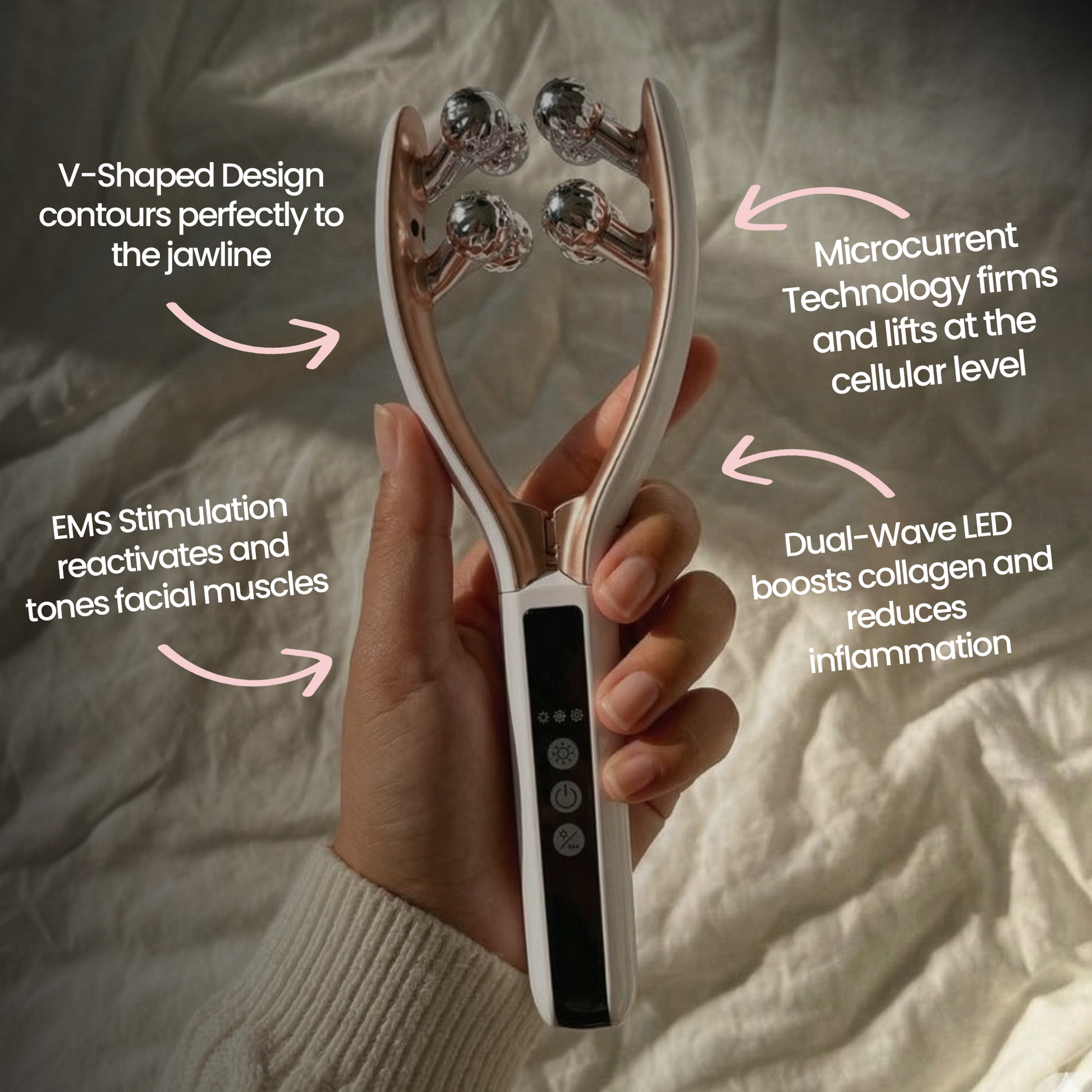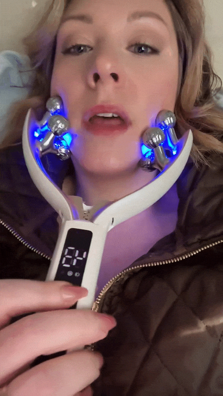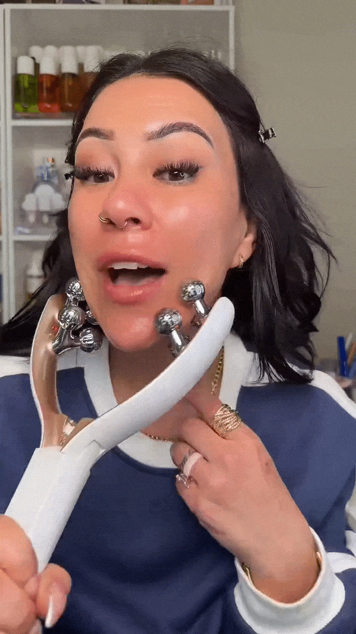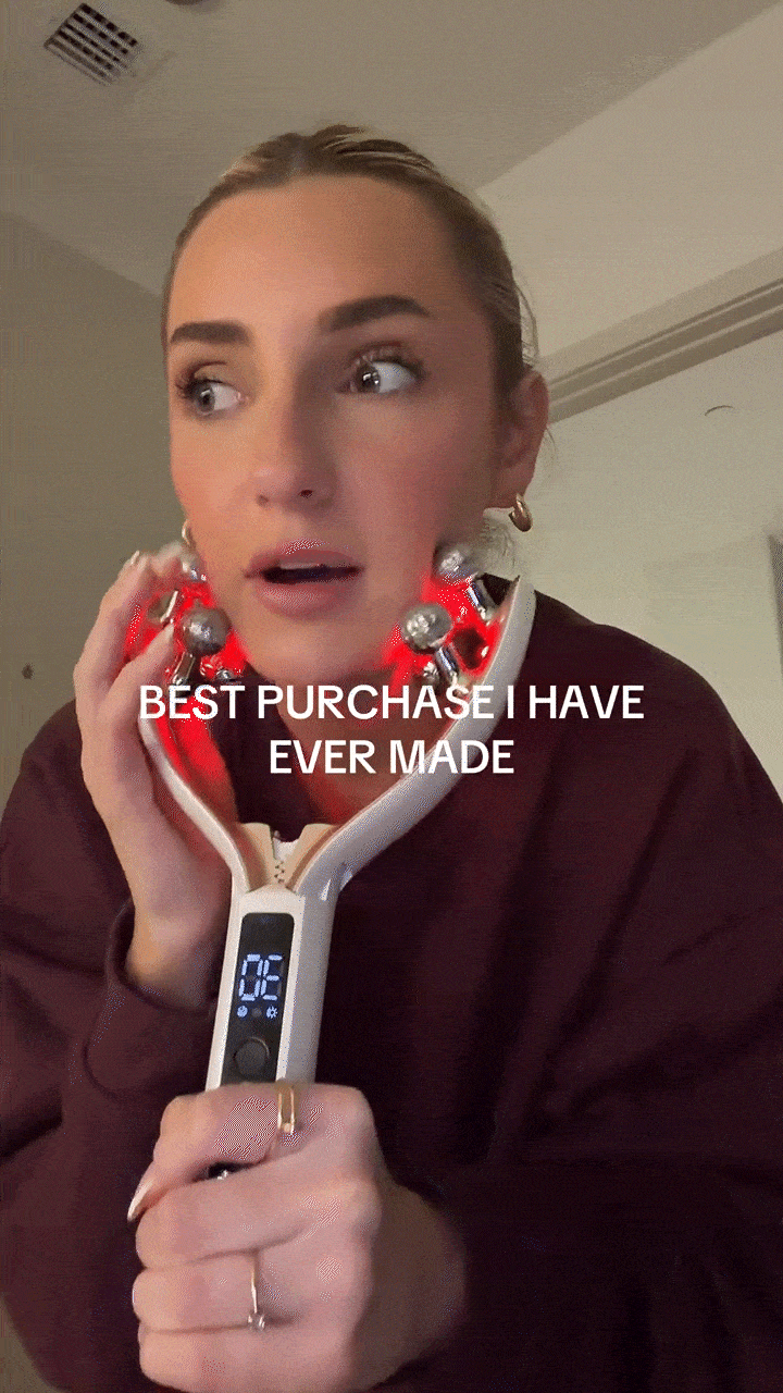 The V-shape is specifically engineered to target the jaw, chin, and neck area simultaneously. The combination of physical rolling and microcurrent stimulation addresses both the fluid retention and muscle laxity that contribute to a soft chin and undefined jaw.