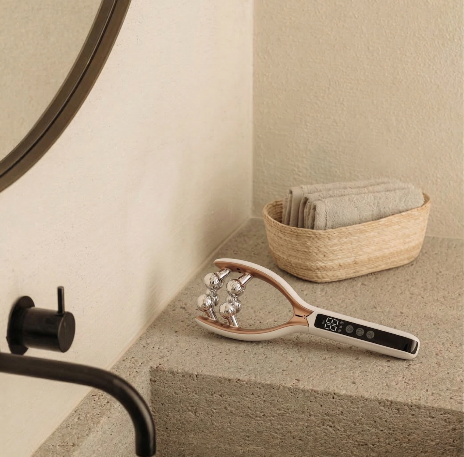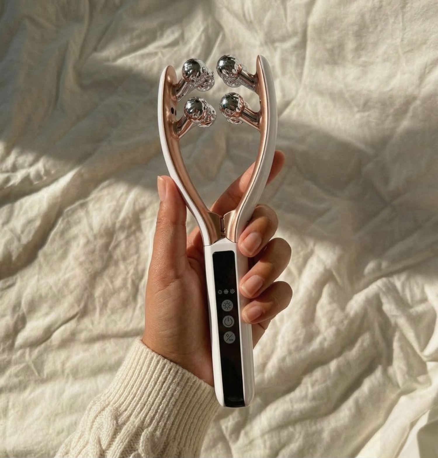 Traditional rollers and gua sha work purely on the surface through manual pressure and friction. The V-Sculpt uses EMS microcurrent to send low-frequency electrical impulses directly into the facial muscles underneath the skin — targeting the structural layer that surface tools can't reach.